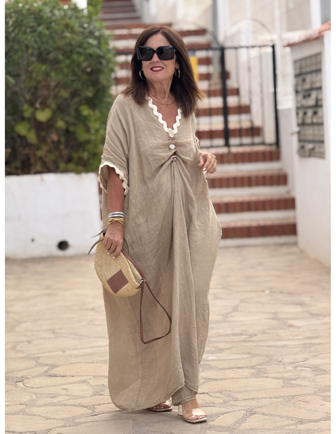 Vestido largo en lino camelcon escote en pico, detalles de abalorios centrales, piculina cruda en escote y mangas y bolsillos laterales. Un diseño fluido y favorecedor, perfecto para los días de sol.