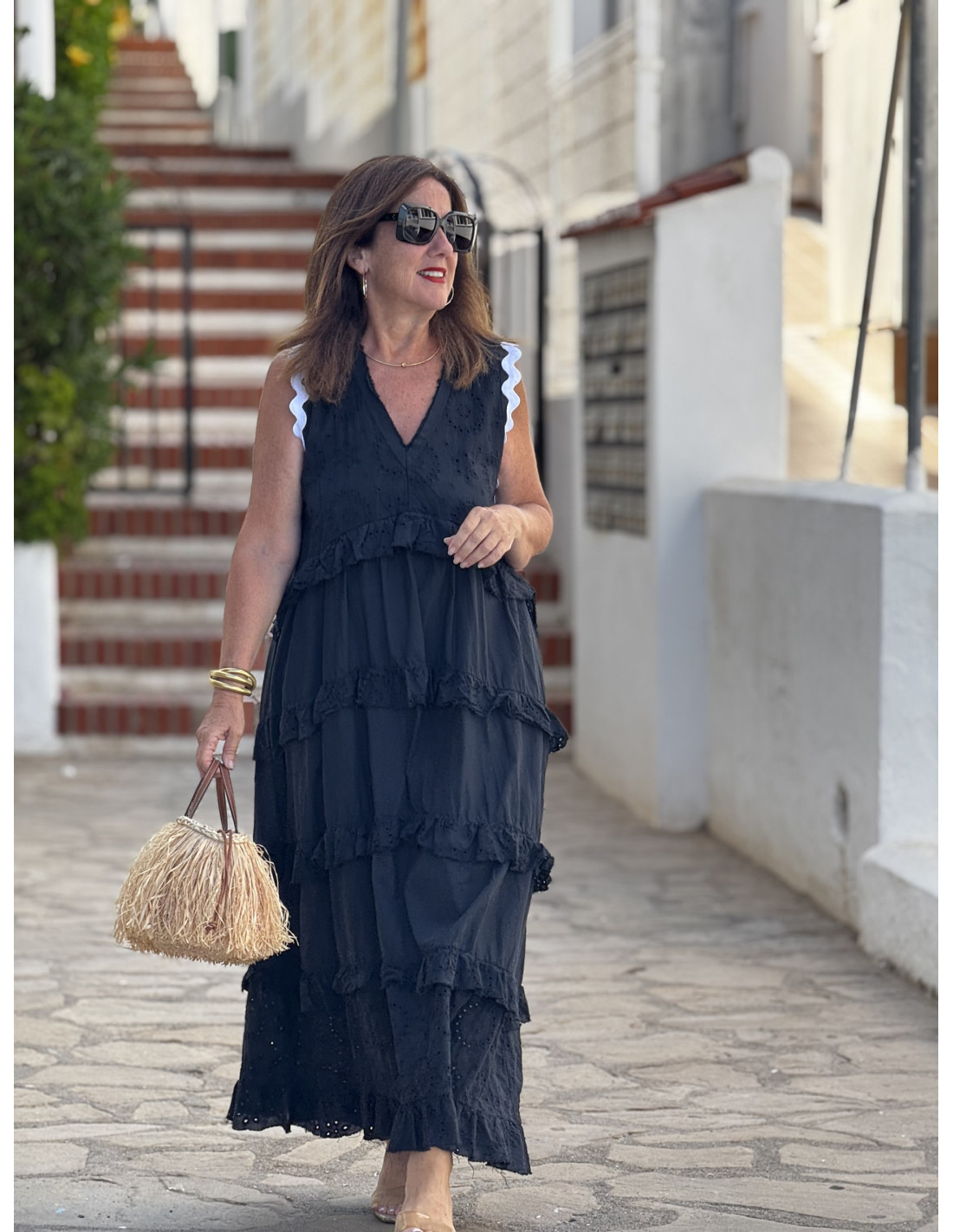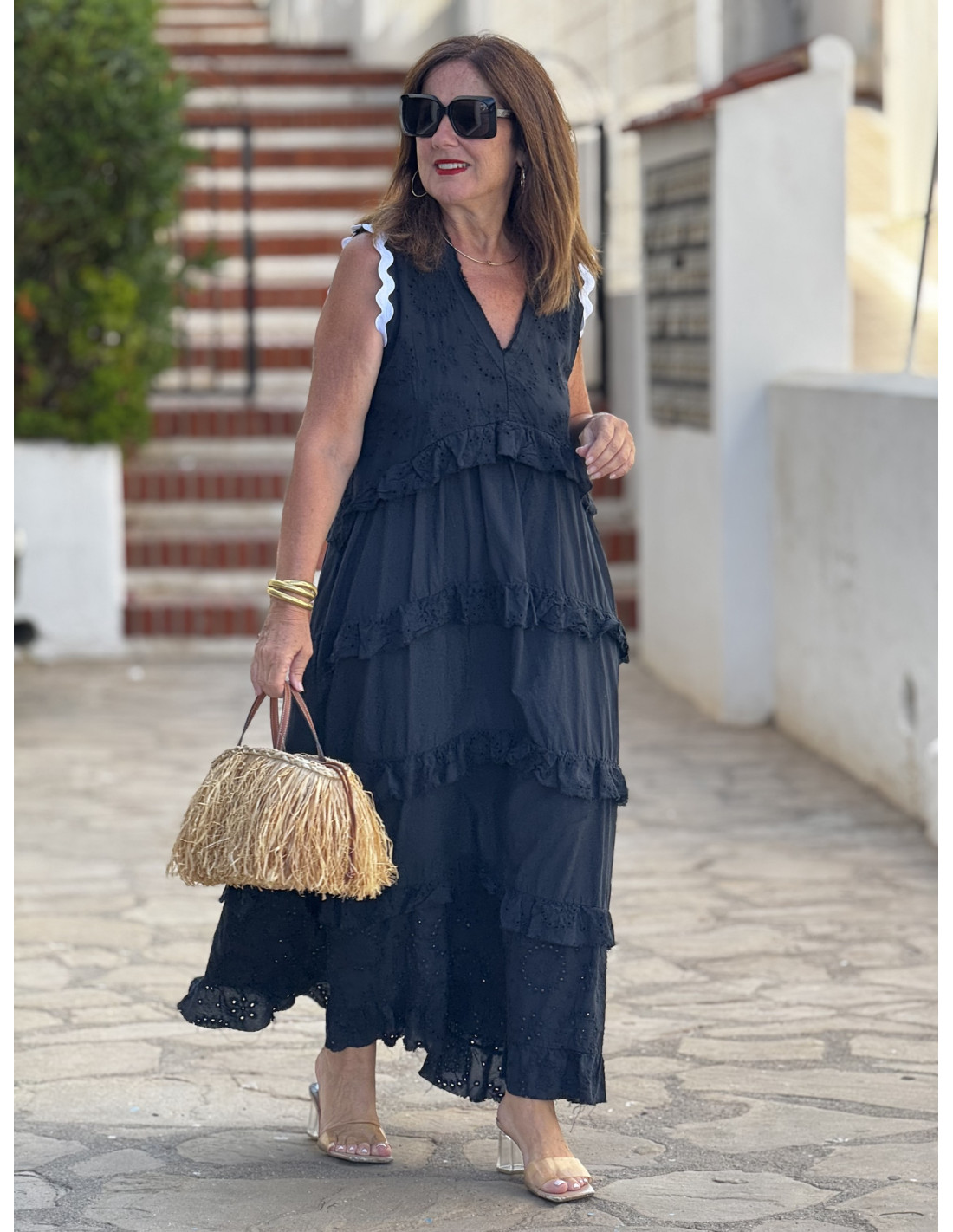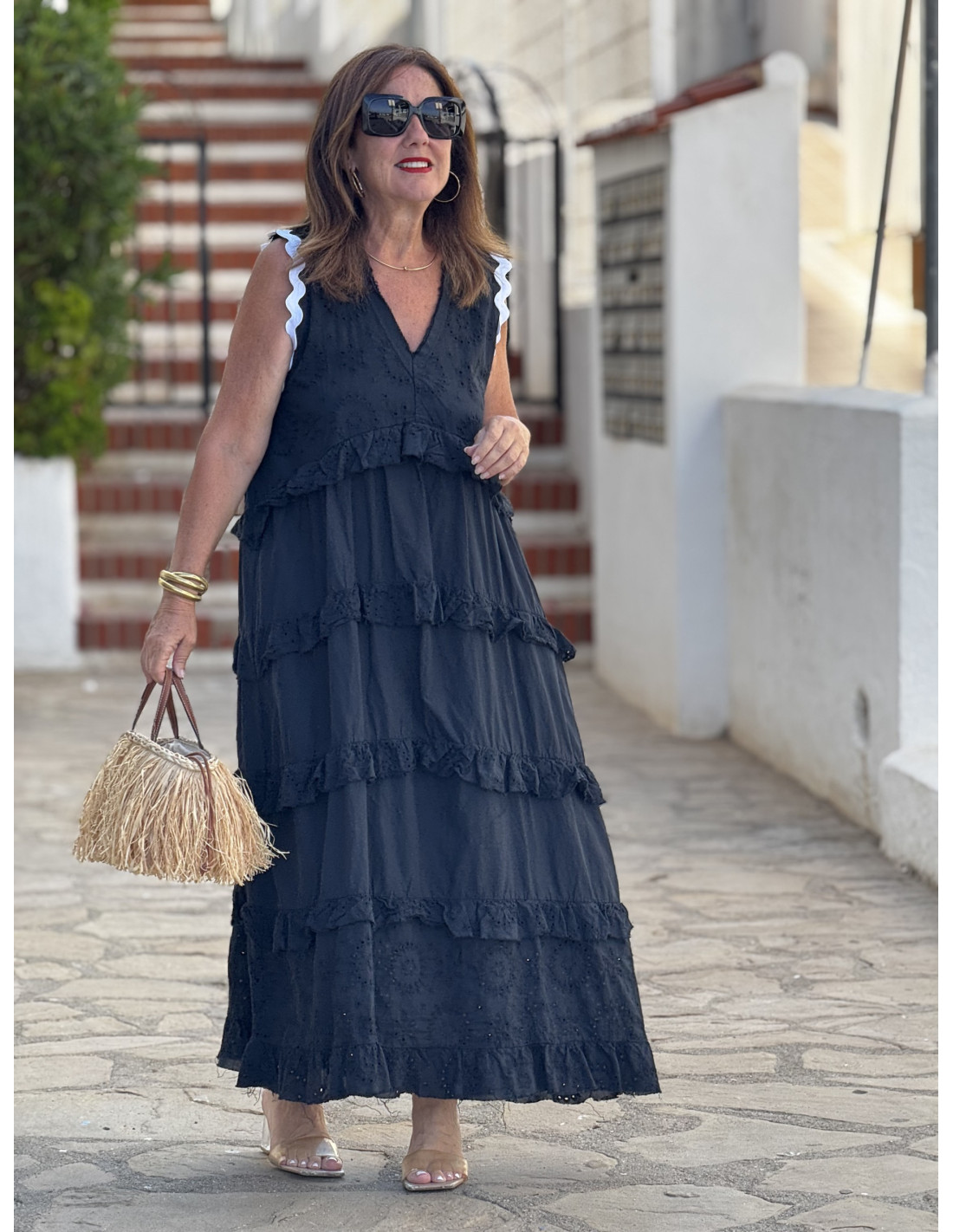 Un vestido que lo tiene todo: bordado inglés, volantes, color vibrante y un corte que favorece a todas. Este modelo en negro combina tejido bordado con algodón liso, aportando textura, movimiento y frescura.