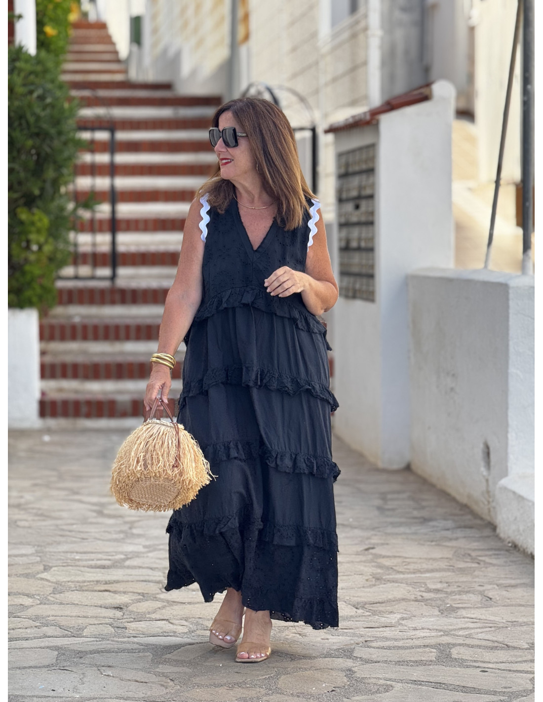 Vestido negro confeccionado en bordado inglés y algodón liso, con detalles de volantes y escote pico. Una prenda ligera, favorecedora y muy especial para los días de verano.