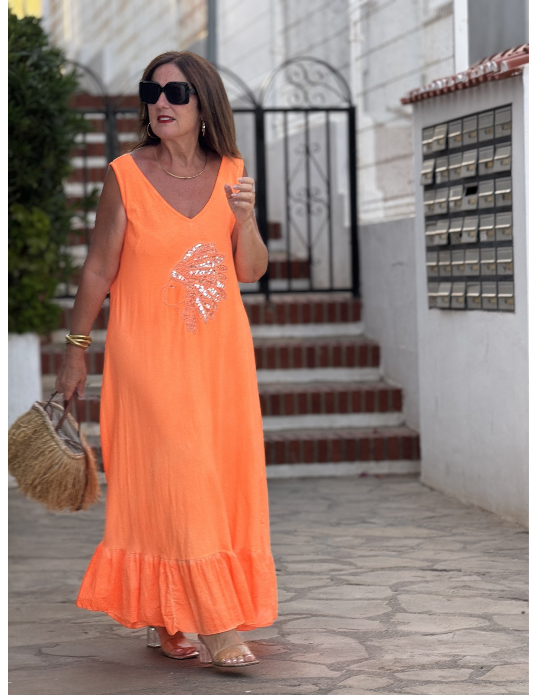 Vestido largo de algodón en tono naranja con escote de pico frontal y trasero. Bordado de cabeza india en lentejuelas y corte evasé con volante en el bajo.