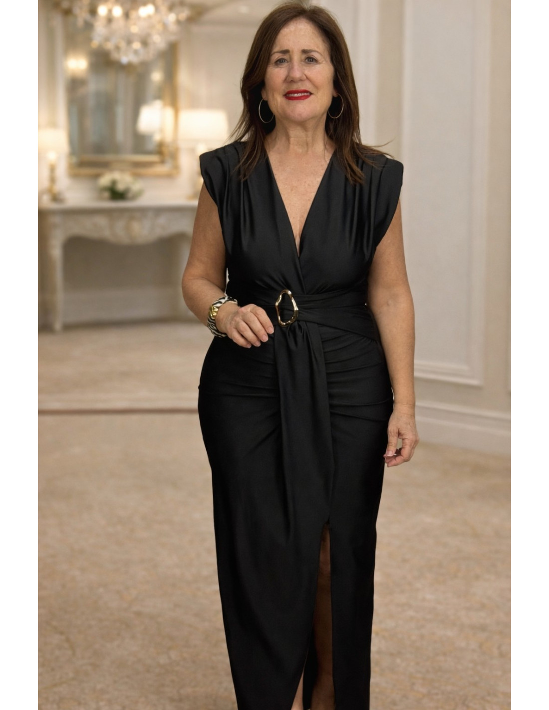 Vestido negro de punto seda elástico con drapeado en la cadera y hebilla dorada. Elegante, favorecedor y perfecto para ocasiones especiales.