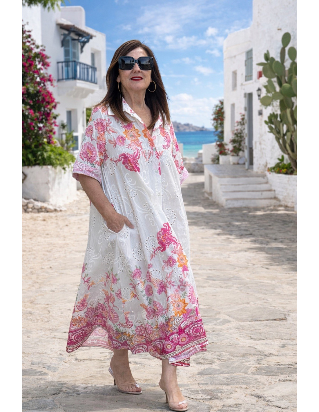 Vestido camisero bordado rosa, fresco y favorecedor
