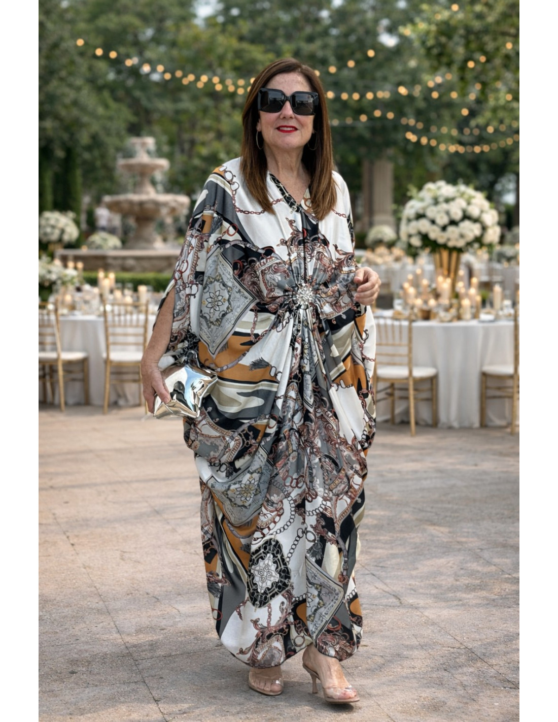Destaca por su escote en pico y su original broche central, que realza la silueta y aporta un toque distintivo al conjunto. El estampado aporta personalidad y estilo, convirtiéndolo en una prenda única y llamativa.