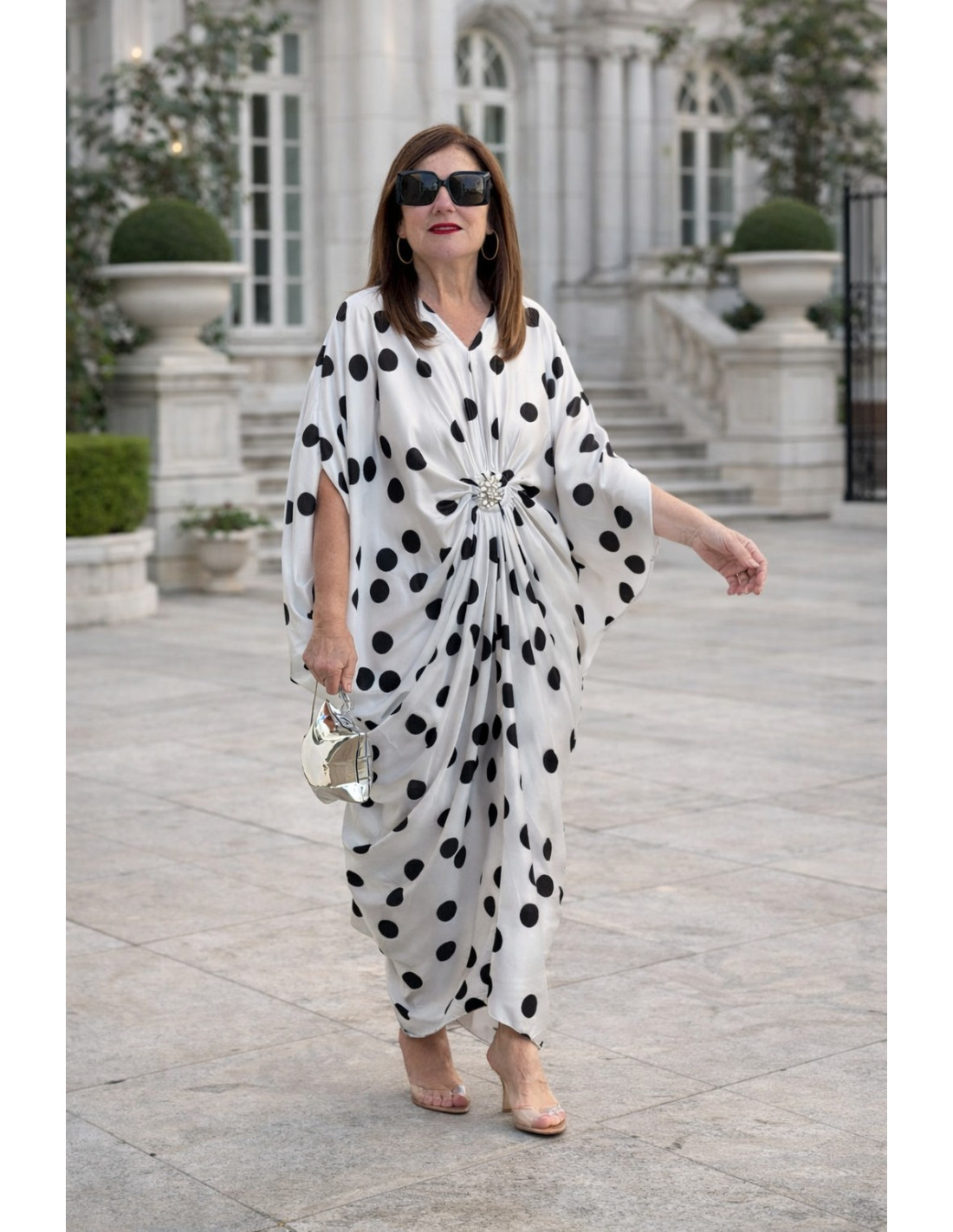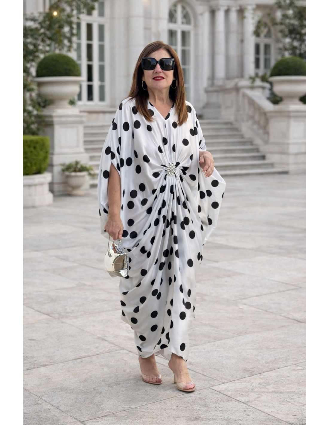 Vestido satén con broche central lunares