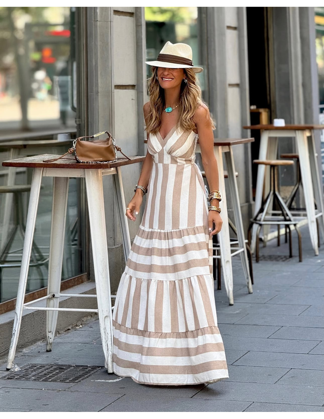 Un vestido espectacular que destaca por su diseño de rayas en tonos neutros y su silueta fluida. El escote en V y la cintura ajustada bajo el pecho estilizan la figura, mientras que la espalda elástica garantiza un ajuste cómodo y favorecedor.
