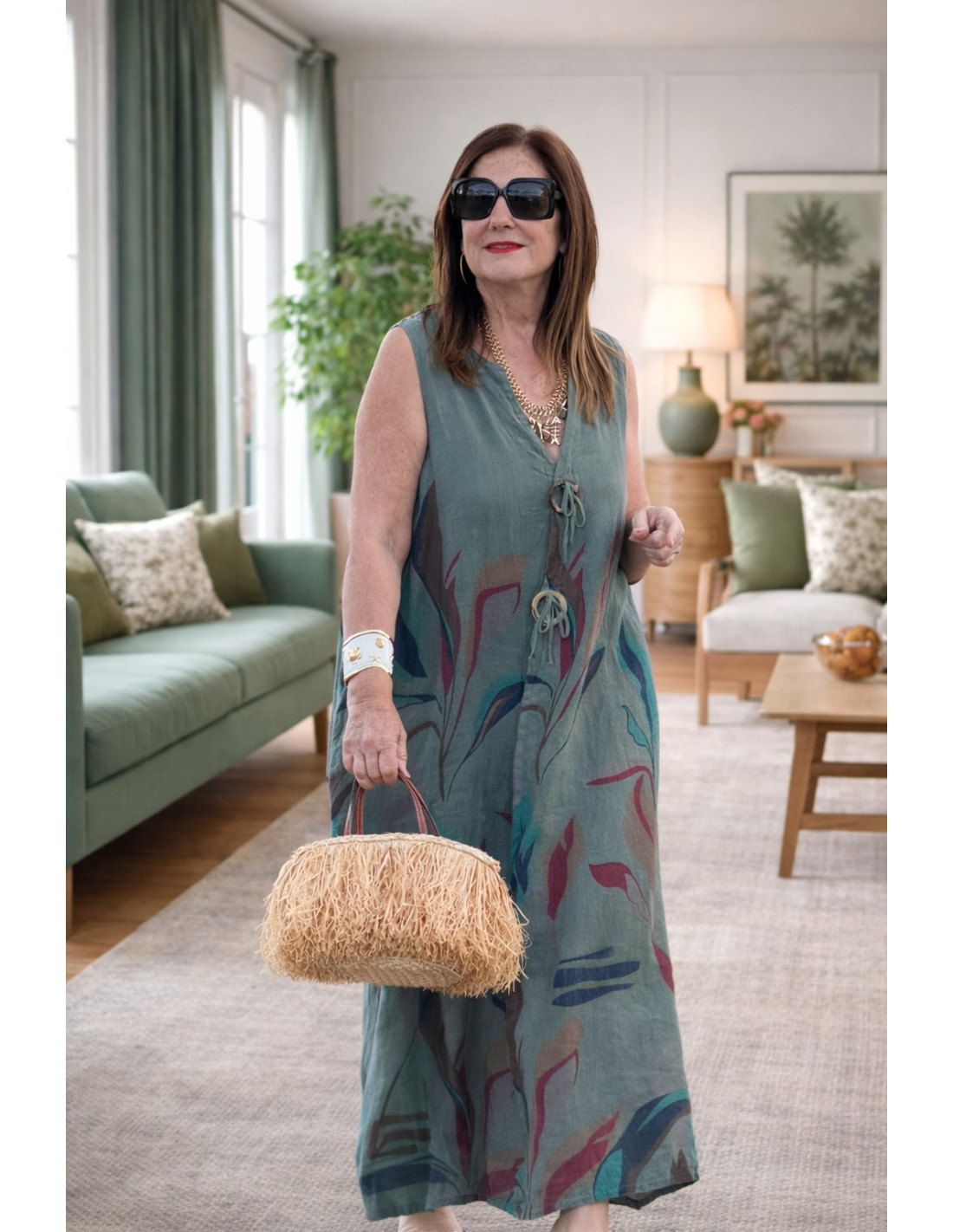 Vestido verde lino estampado hojas