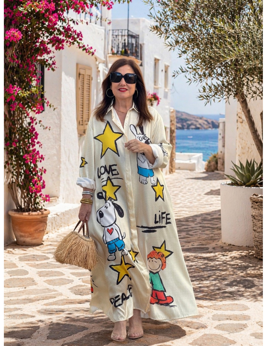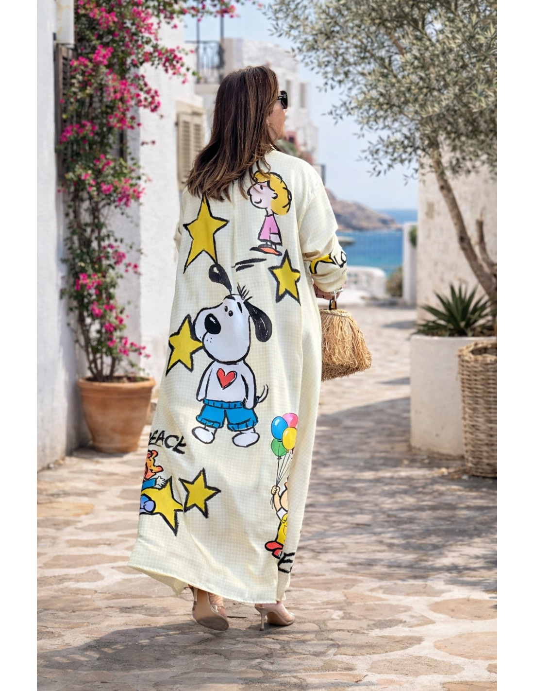Vestido camisero en vichy amarillo y crudo roto con estampado de personajes, muy original y con personalidad. Destaca por sus detalles en cuello y puños que le aportan un toque especial. Con cierre frontal abotonado y bolsillos laterales, es una prenda cómoda, versátil y muy favorecedora para cualquier ocasión.