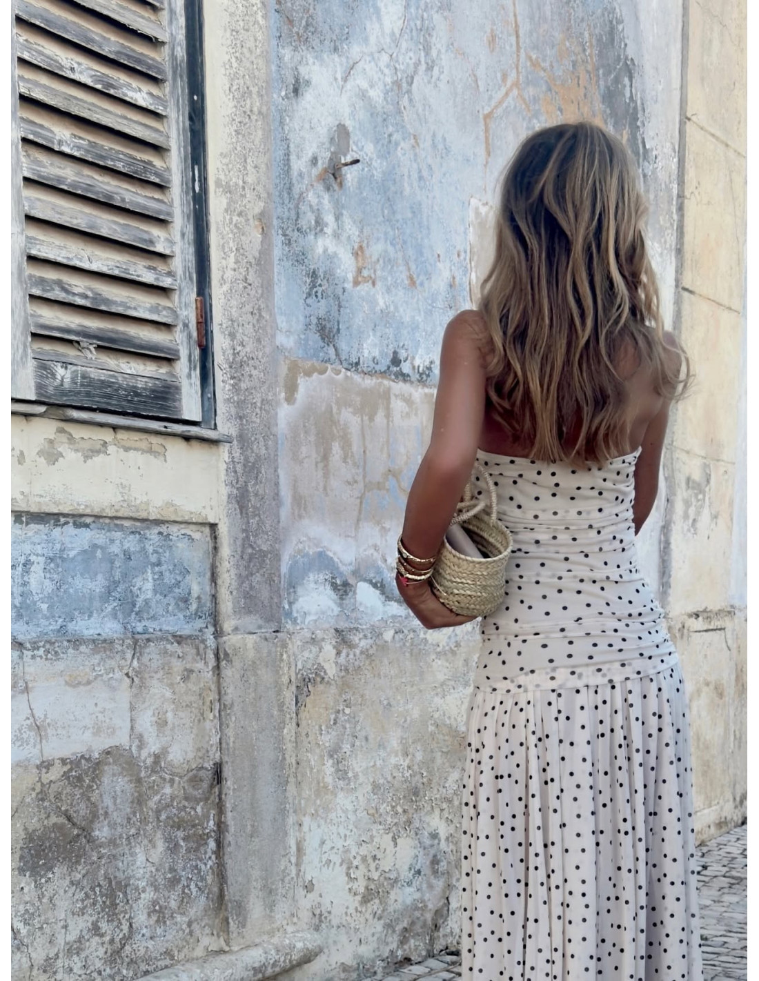 Vestido largo de tul crudo con lunares negros. Diseño palabra de honor con cuerpo drapeado que se ajusta a la figura y falda fluida de gran caída. Dulce y sofisticado.
