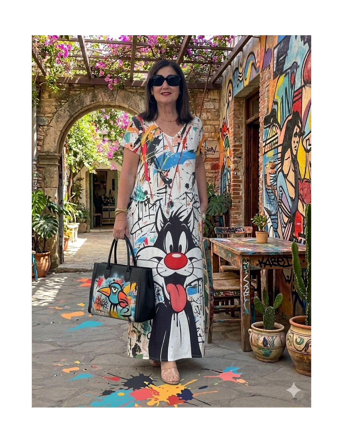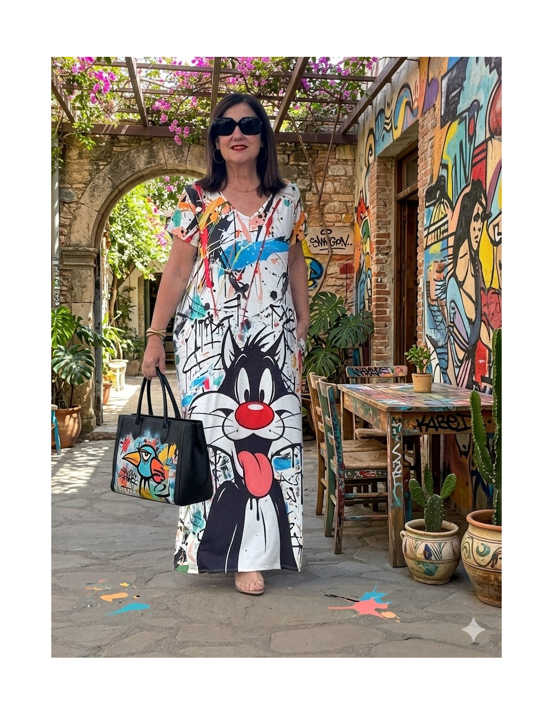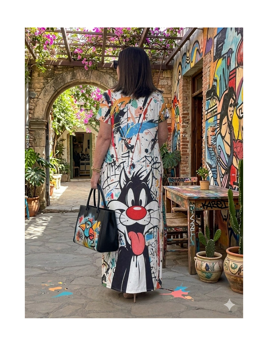 Este vestido largo es puro estilo y actitud. Su diseño destaca por un llamativo estampado artístico tipo graffiti, con un personaje protagonista que aporta un aire divertido, urbano y muy actual.